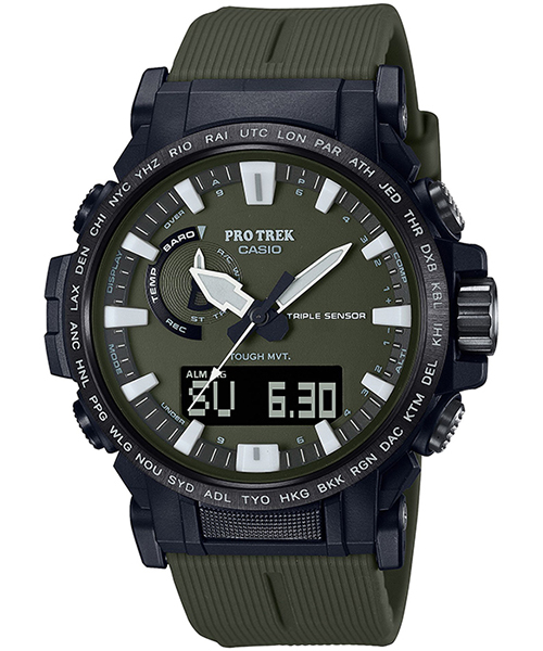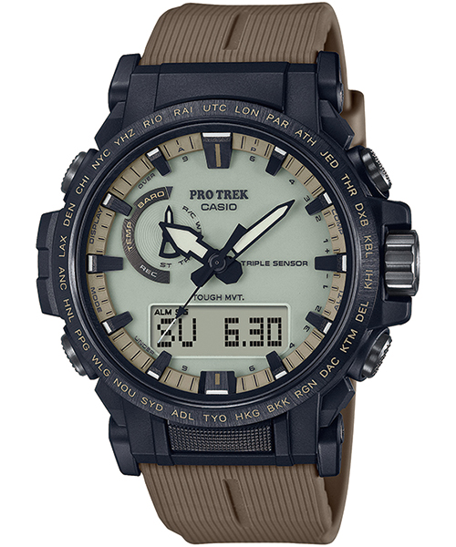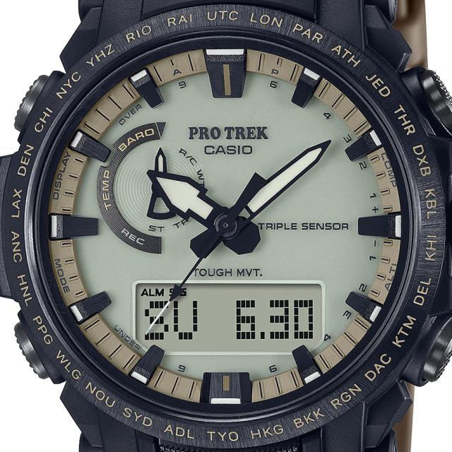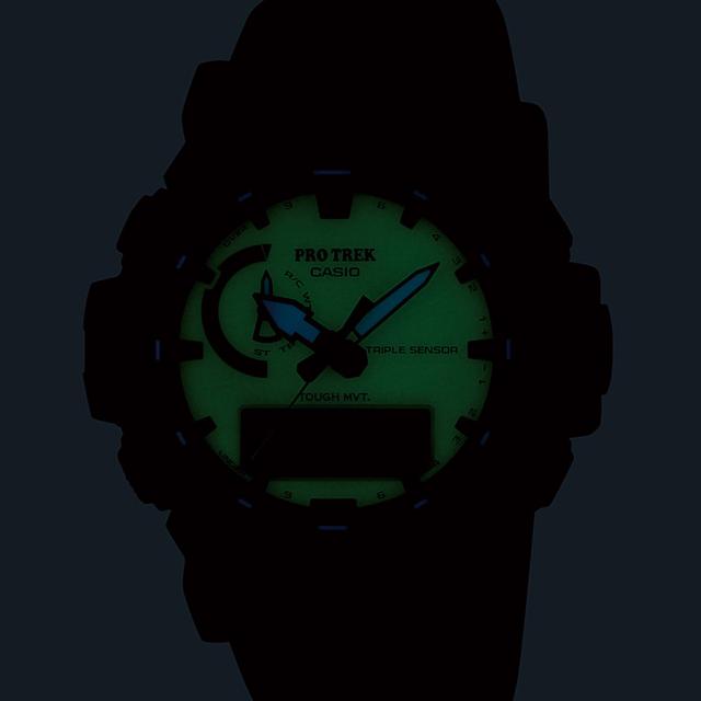 トリプルセンサーが搭載されているので、方位、高度/気圧、温度を計測できます。計測機能に加え、時計本来の機能として世界6局の電波を受信するマルチバンド6やタフソーラーなど実用的な機能も兼ね備えます。夜間の視認性を高めキャンプなどの様々なシーンで対応する高い機能性と実用性を詰め込んだモデルです。