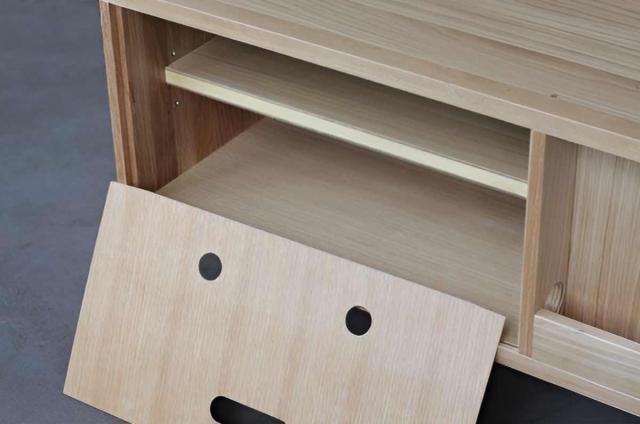 テレビボードの両端は引き戸収納です。可動式の棚板が各引き戸に1枚ずつ付いているので、収納するものに合わせて棚板は3cmピッチで3段階の調節ができます。