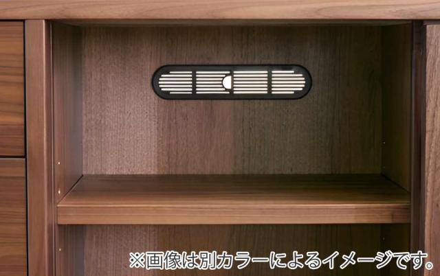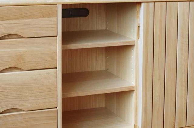 サイドボードの右側は引き戸収納です。可動式の棚板が各引き戸に2枚ずつ、計6枚付いているので、収納するものに合わせて棚板は3cmピッチで11段階の調節ができます。また、一部裏板に配線孔を設けていますのでAV機器を収納することもでき、ハイタイプのテレビボードとしてもお使いいただけます。