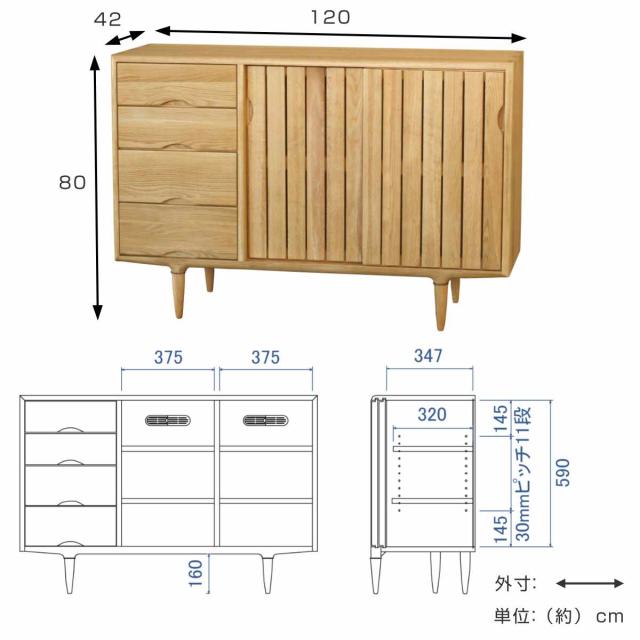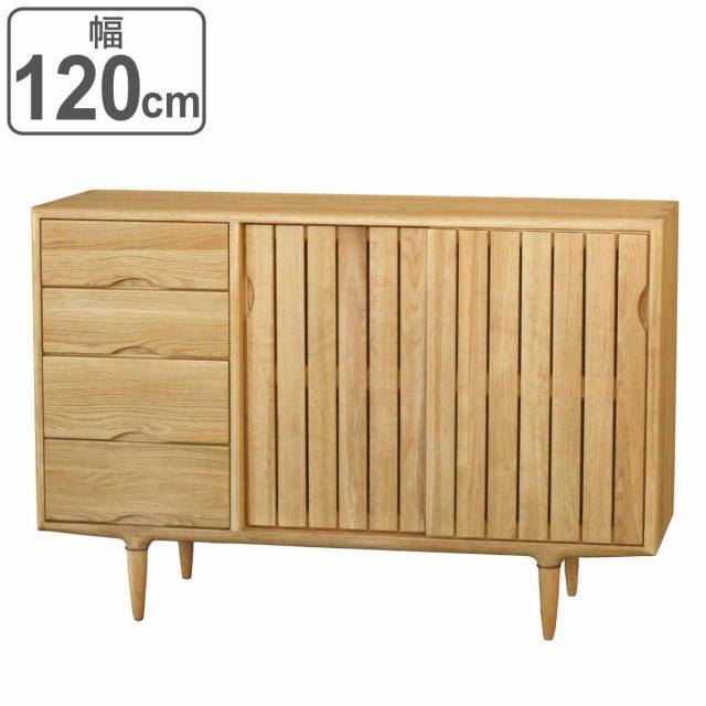 サイドボード 縦格子デザイン オーク無垢材 KISSUI 幅120cm ( 開梱設置 キッスイ サルト 木製 棚 ラック 収納 家具 完成品 無垢 食器棚 リビング ホワイトオーク 引き出し 可動棚 )