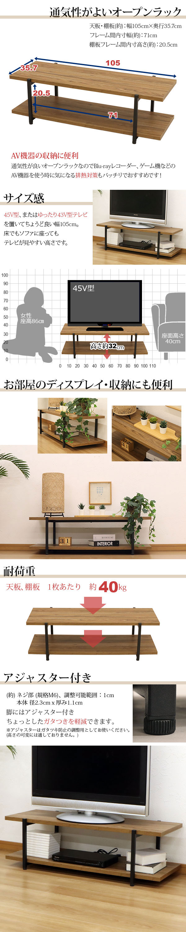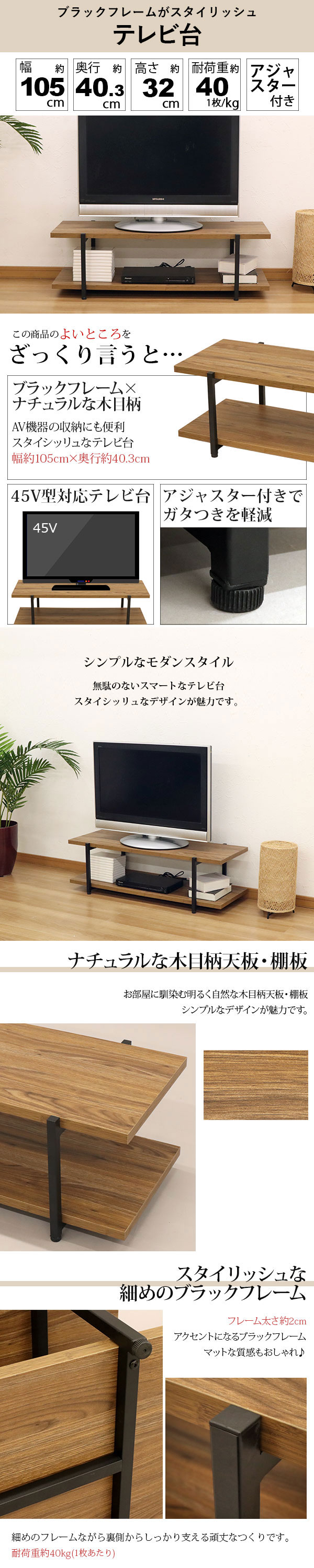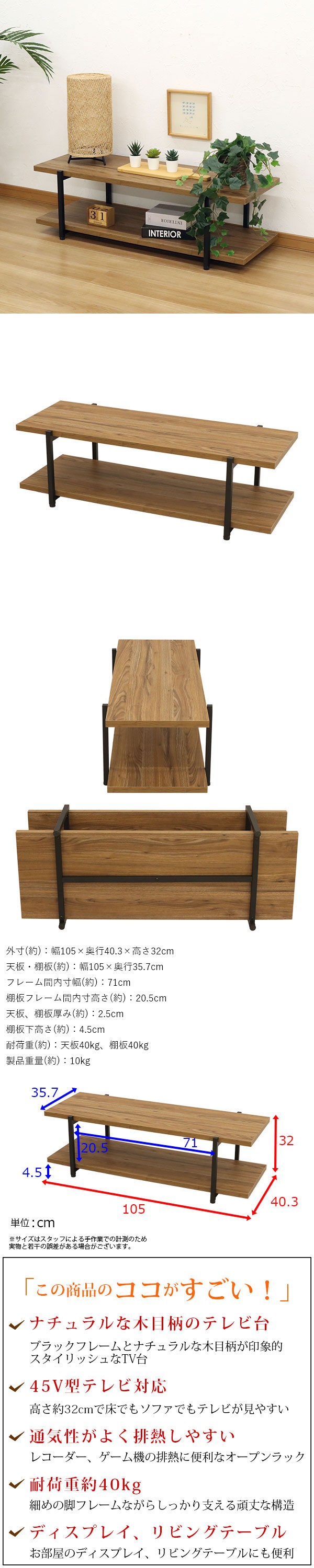 テレビ台 おしゃれ ローボード 105幅 頑丈 45インチ 43インチ 木目柄ナチュラルブラウン 幅105cm 奥行40cm(40.3cm) 高さ32cm アイアン脚ブラックフレーム×木製 アジャスター 45V型 43V型 木製 オープンタイプ オープンラック 通気性 排熱 一人暮らし 新生活 組立簡単