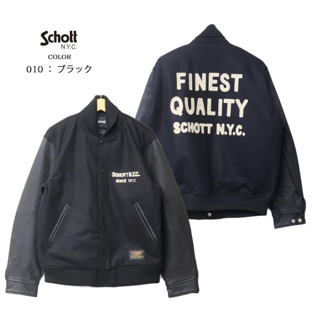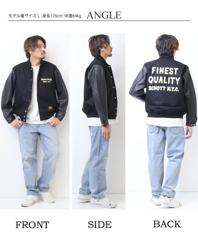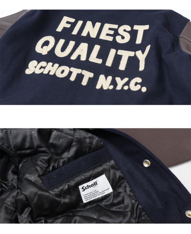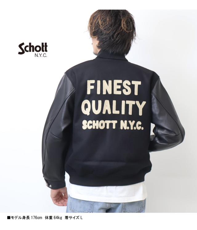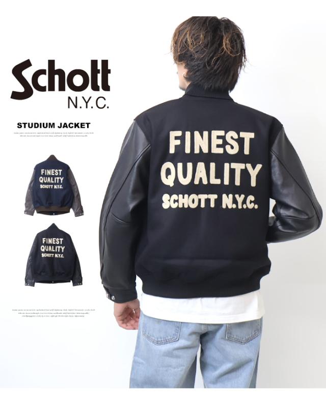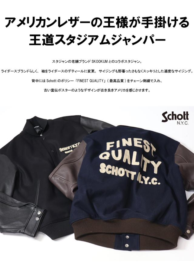 スタジャンの老舗ブランドSKOOKUMとのコラボスタジャン。 ライダースブランドらしく、袖をライダースのデティールに変更。 サイジングも野暮ったさもなくスッキリとした適度なサイジング。 背中にはSchottのポリシー「FINEST QUALITY」(最高品質)をチェーン刺繍で入れ、古い宣伝ポスターのようなデザインが古き良きアメリカを感じさせます。