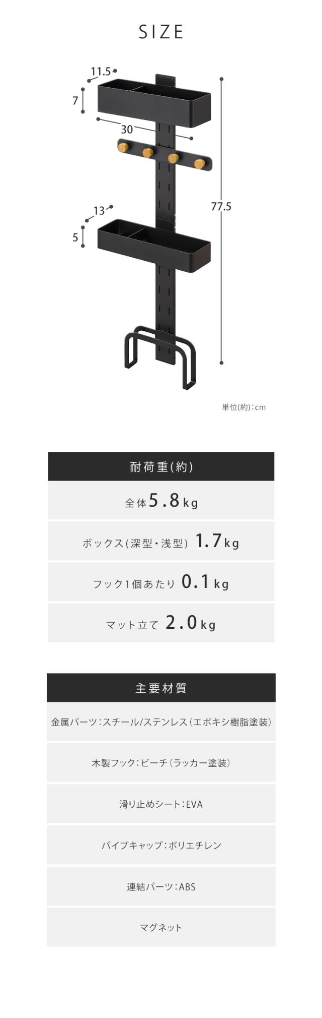 引掛け柱×2、ボックス(深型)、ボックス(浅型)、連結パーツ、フック、マット立て、ねじ×4(予備1)