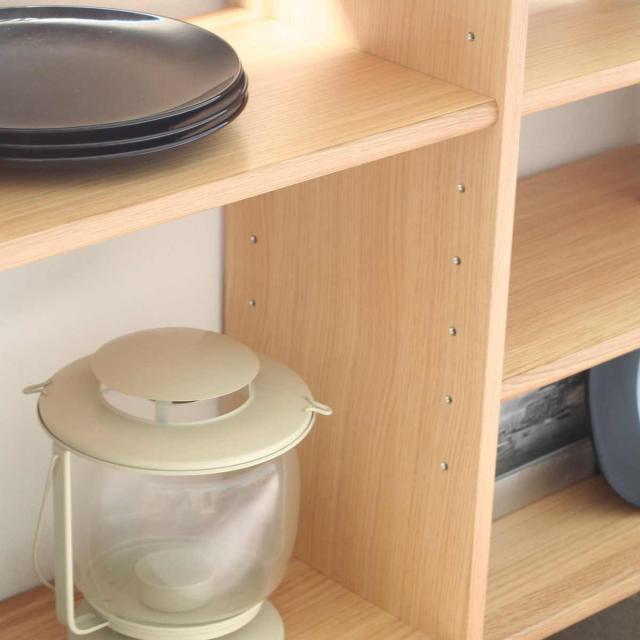 オーク無垢材を使用したオープンシェルフです。天然木ならではの優しくあたたかみのある雰囲気で、どんなお部屋にも馴染んでくれます。飽きの来ない自然の質感を活かしたデザインで、永くお使いいただけます。