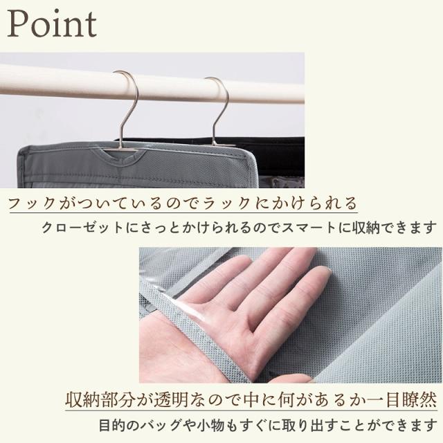 フックがついているのでササっとハンガーラックにかけることができます。また、収納部分が透明なので何が入っているか一目瞭然です!