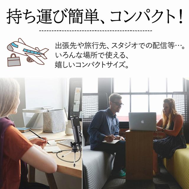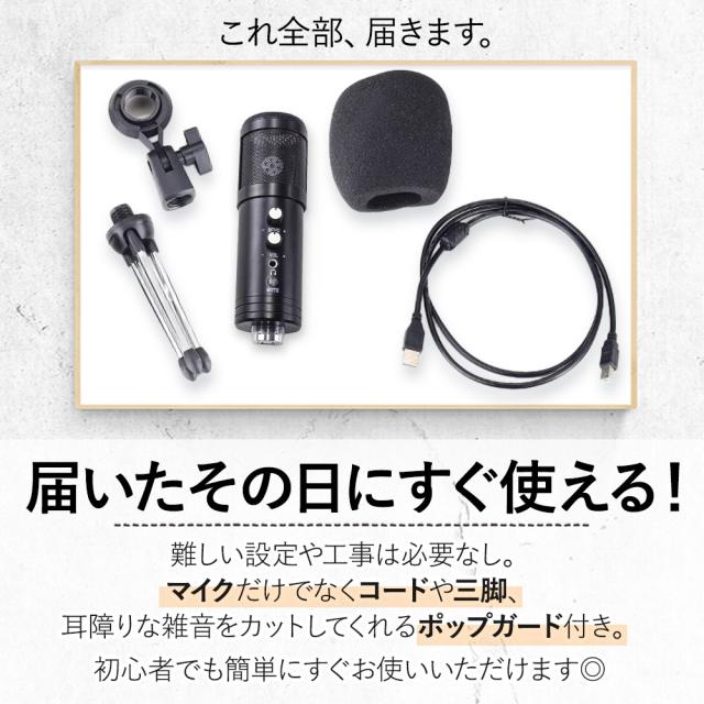 | 商品の説明 | 高音質で、使いやすい。 音を集中的に拾ってくれる優秀なコンデンサーマイクが登場! 楽曲のレコーディングにも使われる、細やかに音を拾ってくれる優秀な機能性。 音声をクリアに録音してくれるだけでなく関係のない音はカットしてくれるので 聞き取りやすい音質を楽しめます。 オンラインでの大事な会議や、遠方とのビデオ面接…。 そんなときにクリアではきはきとした受け答えができるので好印象。 キーボードやマウスを操作する音は入りにくいので、ストレスなく対話ができます。 実は意外と気になるのが空調の音や周囲を走るトラックの音、 子どもの騒ぎ声や謎のノイズ音…。 気になるノイズをカットするノイズキャンリング機能が自然に音をクリアにしてくれます。 マイクだけでなくコードや三脚、耳障りな雑音をカットしてくれるポップガード付き。 初心者でも簡単にすぐお使いいただけます◎ |