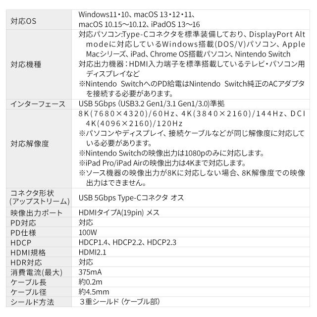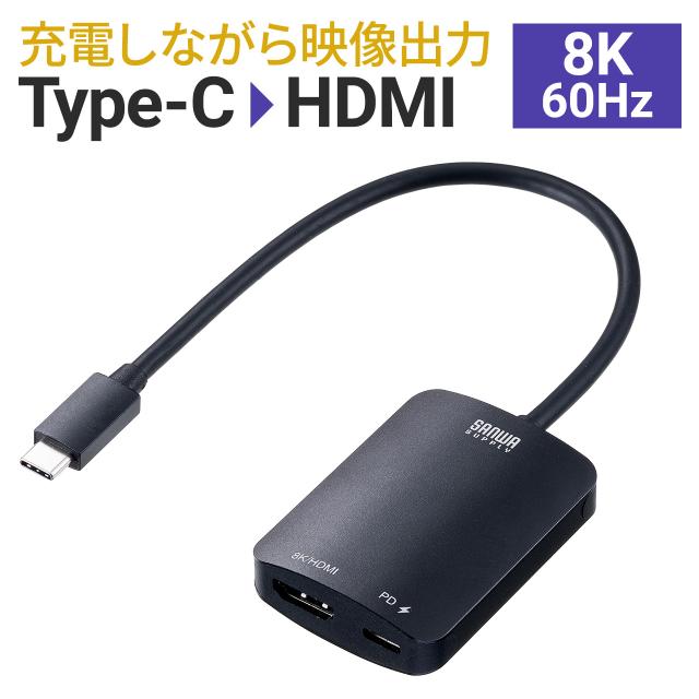 ⇒ご購入の前にご確認下さいType-CからHDMIに変換するアダプタ。8K/60Hzや4K/144Hz出力可能でHDRにも対応。最大100WまでのUSB PD給電に対応で、充電しながら映像出力が可能。映像出力に対応したType-Cポート搭載のWindowsパソコン/Mac、各種タブレット、Nintendo Switch 有機ELモデルなどで使用可能な変換アダプタ。ケーブル長20cm。ブラック。【WEB限定商品】