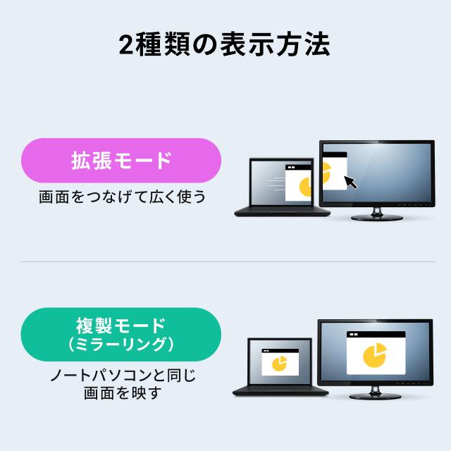 ●USB Type-C(映像出力に対応したType-Cポートのみ)搭載のパソコンやタブレットからHDMI入力端子を持つディスプレイやテレビなどに映像や音声を出力することができます。●USB Type-C接続でのディスプレイ出力「DisplayPort Alt Mode」に対応し、ソフトウェアのインストールなしで簡単にマルチディスプレイ環境(ミラーモード/拡張モード)を実現できます。
