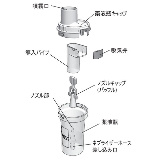 薬液瓶キャップ・吸気弁・導入パイプ・ノズルキャップ(バッフル)・薬液瓶がセットになっております。