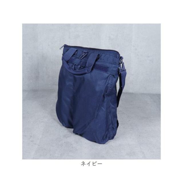 スタイルに合わせて3WAYで使える!ヘルメットバッグが新発売♪【ヘルメットバッグとは】・1950年半ば、航空機のパイロットがヘルメットや酸素マスク等を保護して持ち運ぶために支給されていたヘルメットバッグ。現代ではその収納力や機能性から一般的な市場でも人気を誇るアイテム☆【抜群な収納力】・1泊程度の荷物もスムーズに収納できる大容量さがポイント!A3サイズに対応しファイルや雑誌等の収納もOK!【小物ポケット多数】内側にはクッション材を内蔵したポケットを搭載。ノートPCやタブレット機器の収納もOK!飛び出し防止になる面ファスナーテープ付きのフラップ仕様。フロントにはファスナーポケットを2つ配置。折り畳み傘やペットボトル等の長物収納にもピッタリ。【3WAY】トート・ショルダー・リュックの3通りで使用ができる機能的な作り!シーンやスタイルに合わせてチョイス♪ショルダーベルトは長さ調節ができ、斜め掛け・肩掛け両方OK!【背面ポケット】リュック用の肩ベルトは背面ポケットに収納可能。【クッション材入りのハンドル】手持ちや腕にかけても痛くなりにくいようハンドルにはクッションを内蔵。【快適な背負い心地】リュックの肩ベルトにもクッション材を内蔵し、長時間背負っていても負担がかかりにくい♪ベルトのズレを防いでくれるチェストベルト付き。【Dカン付き】カラビナやフック付きのケースやポーチ等のアクセサリーの取り付けに便利なDカンをリュックの肩ベルトに装備。【ポケット仕様】メインルーム・・・フラップポケット×1、ファスナーポケット×2フロント・・・ファスナーポケット×2背面...スナップボタン付きポケット×1