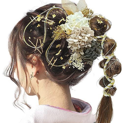JZOON 髪飾り 成人式 ドライフラワー 水引 金箔 銀箔 カスミソウ 組紐 ロープ ヘアアクセサリー 前撮り 振袖 卒業式 結婚式 和装