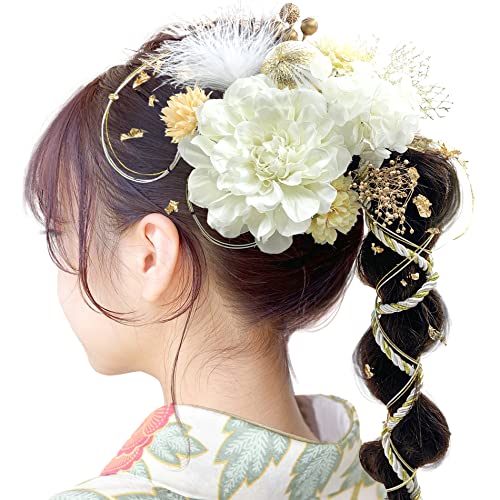 JZOON 髪飾り 成人式 髪飾り 8色 ドライフラワー 造花飾り 水引 紐 ダリア ヘアーアクセサリー 和玉 かすみ草 金箔 和服 着物 振