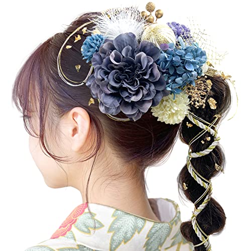 JZOON 髪飾り 成人式 髪飾り 8色 ドライフラワー 造花飾り 水引 紐 ダリア ヘアーアクセサリー 和玉 かすみ草 金箔 和服 着物 振