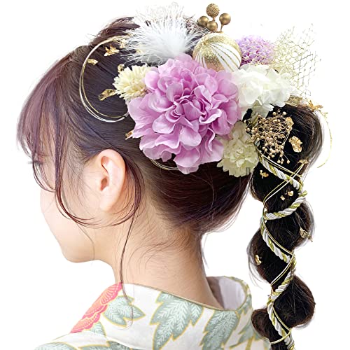 JZOON 髪飾り 成人式 髪飾り 8色 ドライフラワー 造花飾り 水引 紐 ダリア ヘアーアクセサリー 和玉 かすみ草 金箔 和服 着物 振