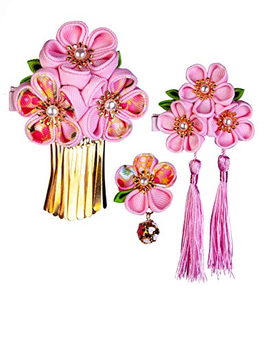 JZOON 髪飾り3点セット 成人式 七五三 浴衣 袴 着物 振袖 和装 つまみ細工 花 卒業式 結婚式 鈴付き 手作り ピンクA 5色全15選