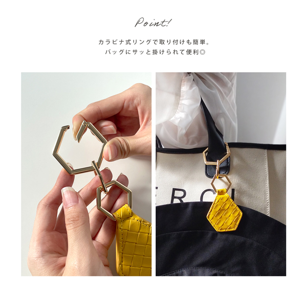 カラビナ式リングで、バッグにつけておくだけでもかわいいデザインです。