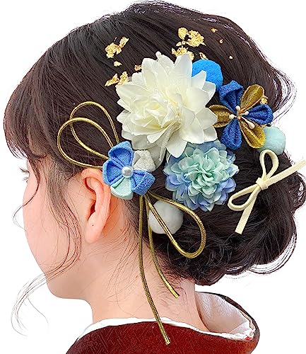 JZOON 成人式 髪飾り ヘアアクセサリー つまみ細工 菊 ピンポンマム クチナシ ポンポン 金箔 リボン 可愛い 手作り 浴衣 袴 着物 振