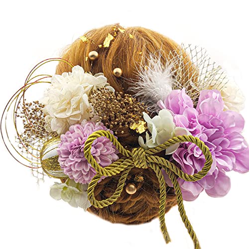 ・華やかな花飾りセットダリアにかすみ草2本、その他プリザーブドフラワーのお花を合わせて計20点の清楚な髪飾り、ヘッドドレスになります。水引は金ゴールド、ダリアは大きくて、華やかで、綺麗な色です。着物、袴などの和装やドレスとの相性が大変よく、高級感が溢れる髪飾りで素晴らしい一日を誰よりも輝いてください。