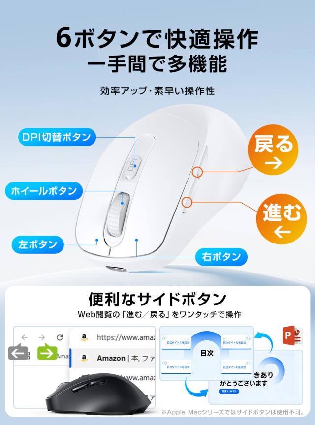 【操作性アップ・6ボタン搭載】 左右クリック+ホイール+戻る/進むボタン付き。