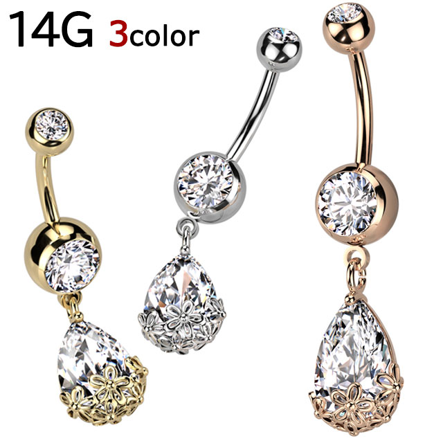 HSP フローラル 花 ティアドロップ しずく ダブルジュエル 316Lサージカルステンレス 14G バナナバーベル ヘソピアス [ フラワー ジュエリー ボディピアス へそピ ボディピ ピンクゴールド ]