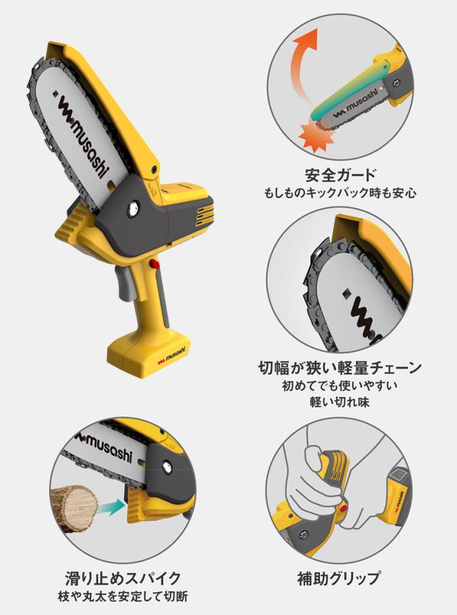 【52%引き】 ムサシ 充電式ハンディチェーンソー(HCS-6000) リチウムイオンバッテリー・充電器付き 切断工具 園芸用機械 切断機械 花 ガーデン DIY ガーデニング 丸太 庭木 幹 太い枝 電動 伸縮 剪定 ハイパワー