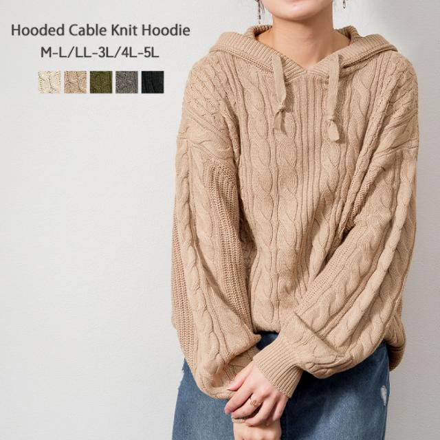 ケーブル編みニットパーカー レディース 大きいサイズ M L LL 3L 4L5L 黒 白 グレー ベージュ カーキ