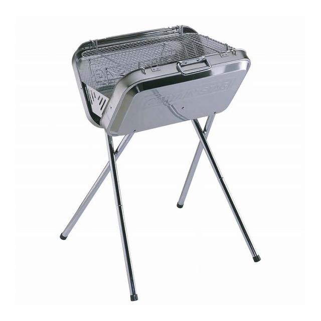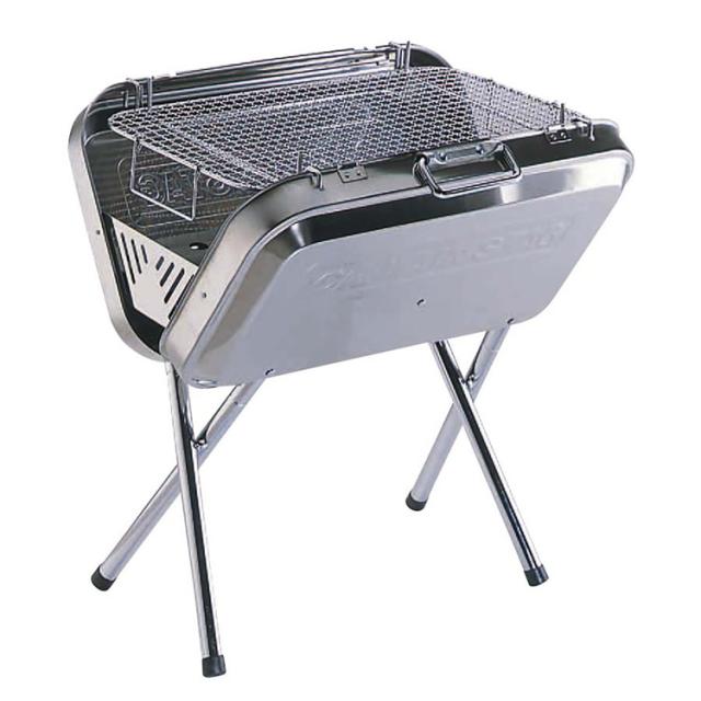 高さが2段階調節ができるバーベキューコンロ。持ち手の付いたトランク型に収納可能です。