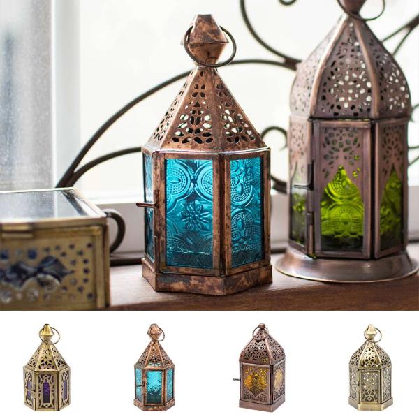 繊細な透かし柄と色鮮やかなレリーフガラスが美しいモロッカンキャンドルホルダー。