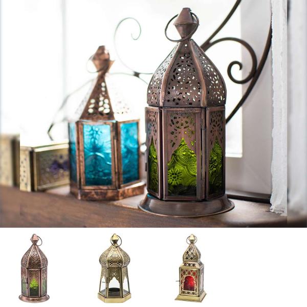 繊細な透かし柄と色鮮やかなレリーフガラスが美しいモロッカンキャンドルホルダー。