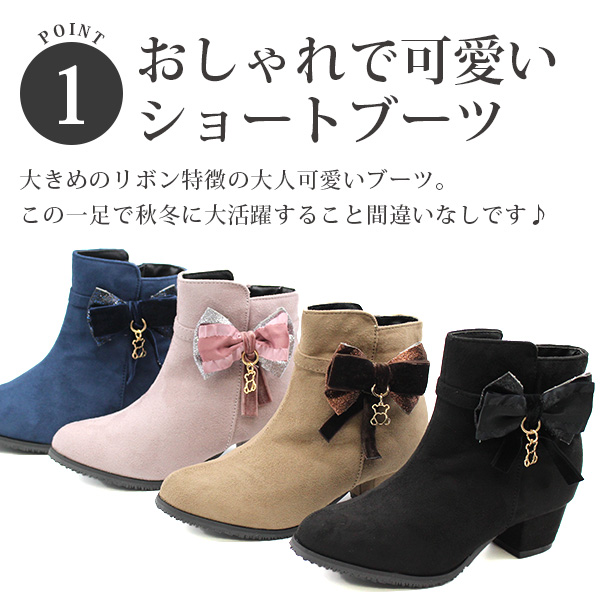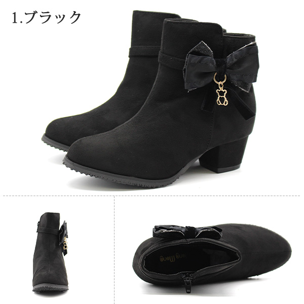 大きめのリボン特徴の大人可愛いブーツ。この一足で秋冬に大活躍すること間違いなしです。サイドファスナー付きなので、脱ぎ履きが簡単でストレスなく、使用することができます。ヒールは横幅も広く、お子様でも安全に履ける設計。とても安定しており、安心して履けるヒールです。リボンにはハートを持った熊のアクセサリーがついており、ワンポイントがお洒落なデザインです。