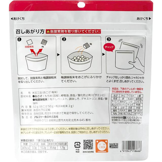 非常食 保存食 安心米 アルファー食品【 おこげ 梅味 1食 】 そのまま食べられる ( アルファ米 備蓄用 災害食 登山 キャンプ 5年保存 水不要 食器不要 アレルギー対応 ハラール対応 国産米 常備 )
