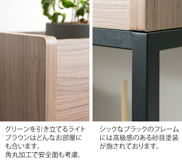 落ち着きのあるライトブラウンの木目柄と細めのブラックフレームはグリーンを引き立てます。