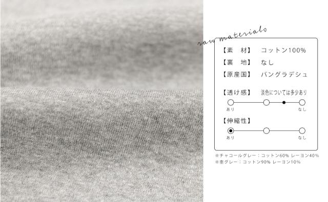| 【素材】コットン100%※杢グレーのみ コットン90%/レーヨン10%※チャコールグレーのみ コットン60%/レーヨン40% 【裏地】なし【透け感】淡色については多少あり【伸縮性】あり【原産国】バングラデシュ |