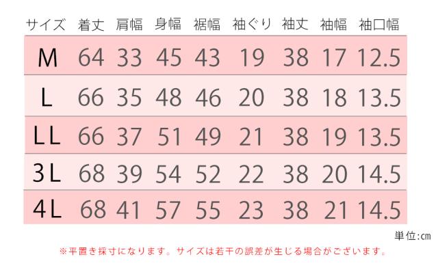 | [Mサイズ]着丈:64cm、肩幅:33cm、身幅:45cm、裾幅:43cm、袖ぐり:19cm、袖丈:38cm、袖幅:17cm、袖口幅:12.5cm [Lサイズ]着丈:66cm、肩幅:35cm、身幅:48cm、裾幅:46cm、袖ぐり:20cm、袖丈:38cm、袖幅:18cm、袖口幅:13.5cm [LLサイズ]着丈:66cm、肩幅:37cm、身幅:51cm、裾幅:49cm、袖ぐり:21cm、袖丈:38cm、袖幅:19cm、袖口幅:13.5cm [3Lサイズ]着丈:68cm、肩幅:39cm、身幅:54cm、裾幅:52cm、袖ぐり:22cm、袖丈:38cm、袖幅:20cm、袖口幅:14.5cm [4Lサイズ]着丈:68cm、肩幅:41cm、身幅:57cm、裾幅:55cm、袖ぐり:23cm、袖丈:38cm、袖幅:21cm、袖口幅:14.5cm ※平置き実寸サイズとなります為、若干の誤差が生じる場合がございます。 |