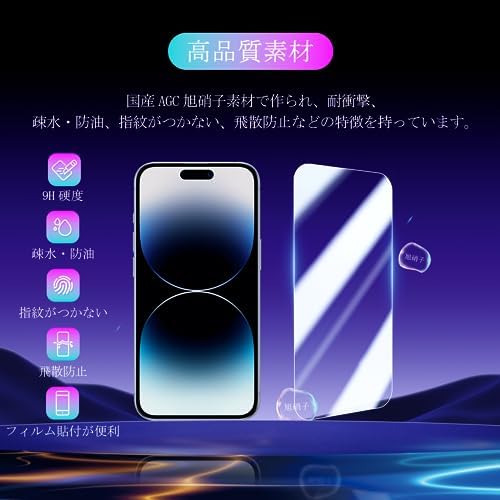 iPhone 15 専用の保護フィルムとカメラレンズプロテクターは、日本のAGC旭硝子素材を採用して作られており、その硬さは業界リードレベルの9Hに達し、強度が高いナノ弾性衝撃と防爆効果を備えて、画面が落下、衝撃、引っかき傷、日常の摩耗や損傷などを防止して、保護できます。