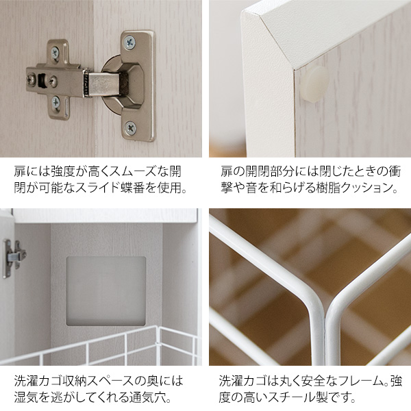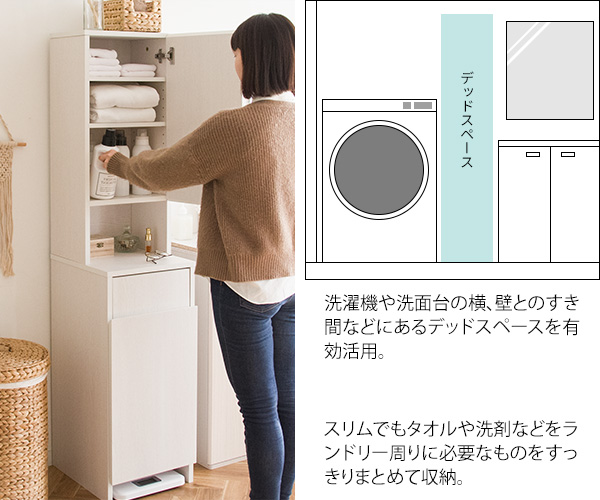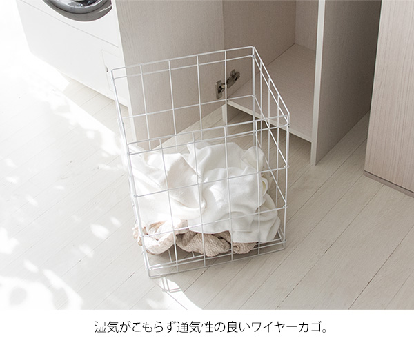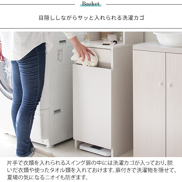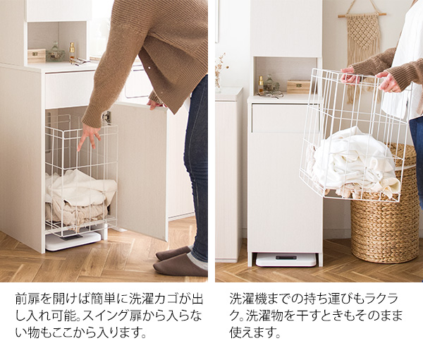 わずかなスペースにたっぷり収納できて、洗濯カゴも出し入れ簡単なので洗面台や洗濯機の隣にあれば活躍間違いなしです。