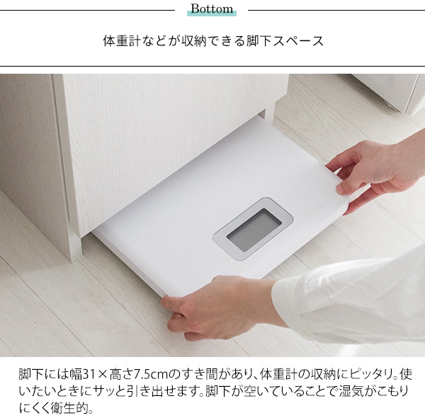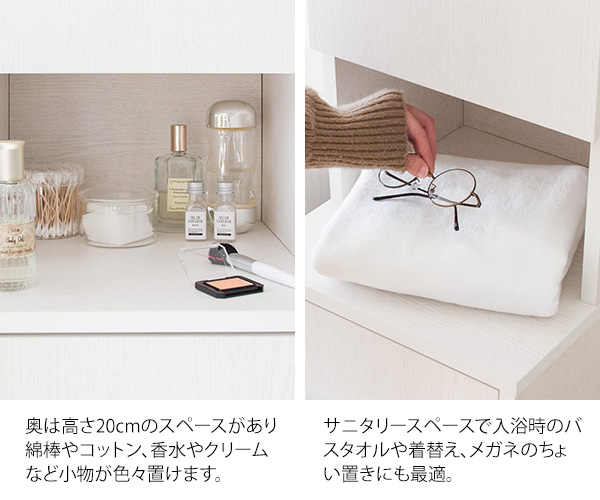 可動式の棚で洗剤や小物が収納できる収納棚、入浴時に外したメガネやコスメが置ける天板、脱いだ服やタオルを隠しながら入れられる扉付きの洗濯カゴスペース等々、スリムでも収納力や実用性が高いデザイン。