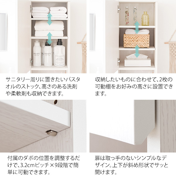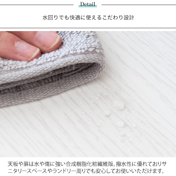 ランドリースペースや、サニタリー周りなどの狭い空間でもデッドスペースを活用して収納をしていただける幅35mのスリムサニタリーチェスト。