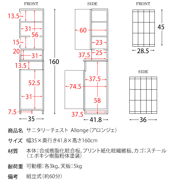 | 材質 | 本体:合成樹脂化粧合板、プリント紙化粧繊維板、カゴ:スチール(エポキシ樹脂粉体塗装) |