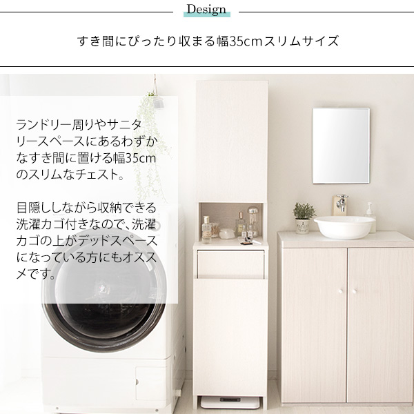 洗面所 収納 洗濯カゴ付き 脱衣所 収納 隙間収納 すき間収納 幅35cm 奥行41.8cm 高さ160cm スリムチェスト タオル収納 洗剤収納 棚付き 体重計収納 サニタリー キッチン 収納付きごみ箱としても使用可能 ランドリーチェスト ランドリーバスケット ホワイト 白 木目デザイン