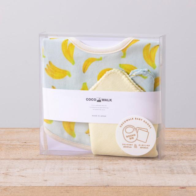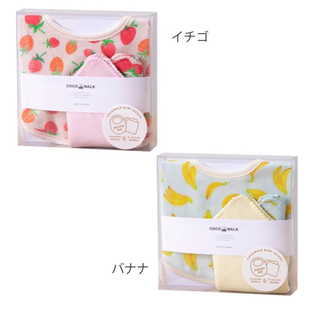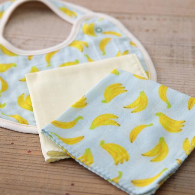 フルーツ柄のスタイ1枚とハンカチ2枚が入ったギフトボックスです。使う頻度の高いもののセットなので、お母さん・お父さんにも喜ばれます。イチゴとバナナの2種類があります。