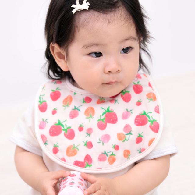 横スナップボタン式なので、赤ちゃんがねんねしていても簡単に外せます。首回りのサイズに合わせて、2段階に調整可能です。赤ちゃんの汚れた口元を拭いたり、よだれや食べこぼし、飲みこぼししても服が汚れないように衣類を守ります。