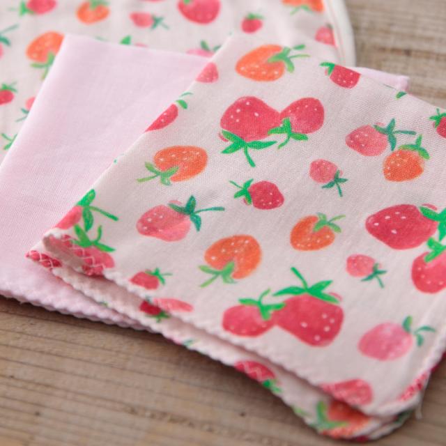 ハンカチはフルーツ柄と無地の2枚が入っています。その日のお洋服やシーンに合わせて使い分けができます。また、肌触りの良いガーゼハンカチなので、赤ちゃんの沐浴ガーゼや、お食事タイムのお手拭きとしてもおすすめです。