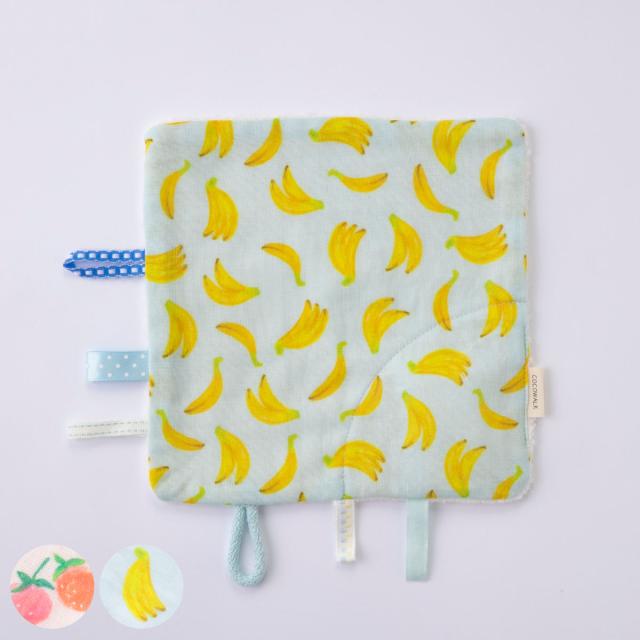角の一つに押し笛が入っており、押すと音が鳴ります。おもちゃのように赤ちゃんが楽しめるハンカチです。