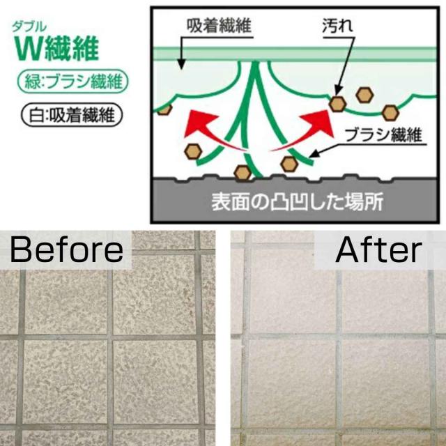 ダブル繊維がタイルの表面などの凸凹に入り込むことで、洗剤を使わず水だけで汚れをかき出します。玄関、外壁、ベランダなどのお掃除に最適です。
