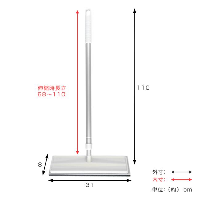 | サイズ | 約 幅31×奥行8×高さ110(cm) 伸縮時長さ:約 68〜110(cm) 拭き幅:約 30(cm) |