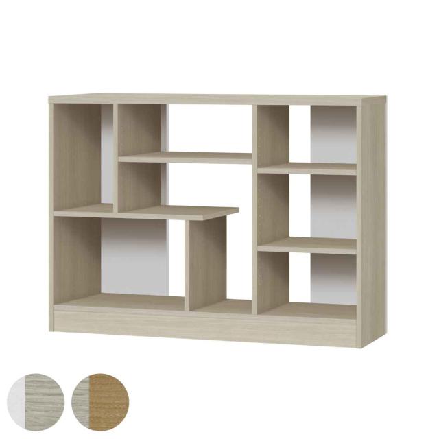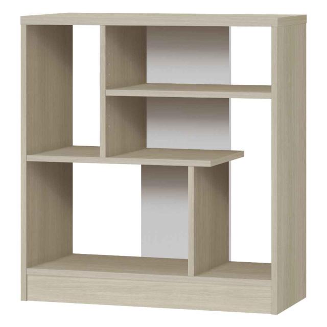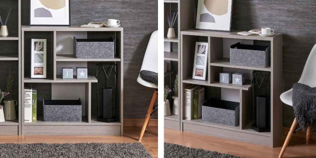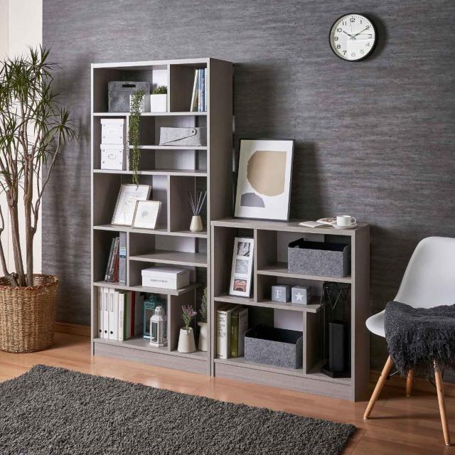 グレージュの2トーン配色がモダンを醸し出すデザインのオープンシェルフです。コンパクトサイズなので使い勝手もちょうどいい。アシンメトリーデザインがおしゃれで、見せ方がいろいろできる北欧モダンインテリアです。