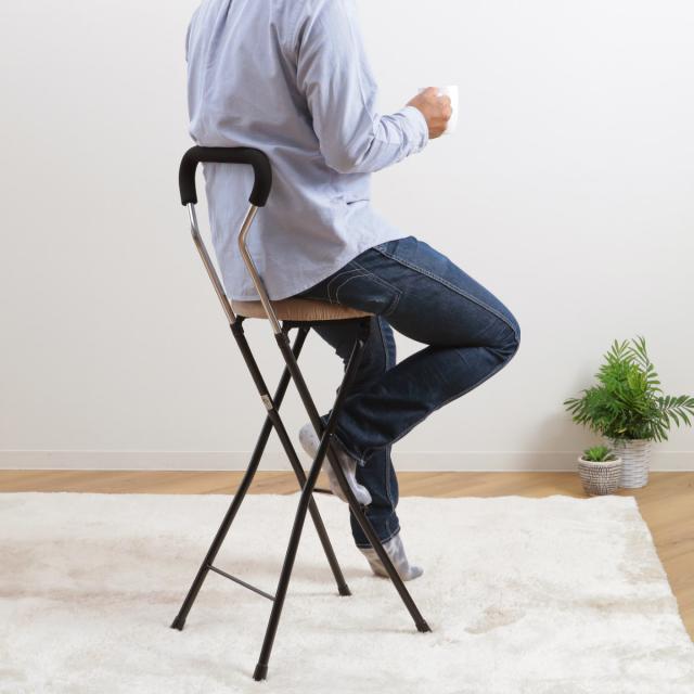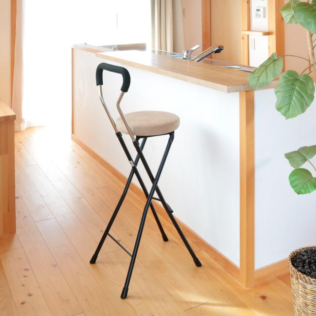 座面高約74.5cmのチェアはハイチェアの中でも座面が高めの設計で、カウンターテーブルなどのテーブルに合わせやすく、キッチンのちょっとした腰掛けに使いやすいサイズ感です。折りたたみ可能で使用しない時はコンパクトに収納でき、急な来客時の簡易チェアにもピッタリでとっても便利です。