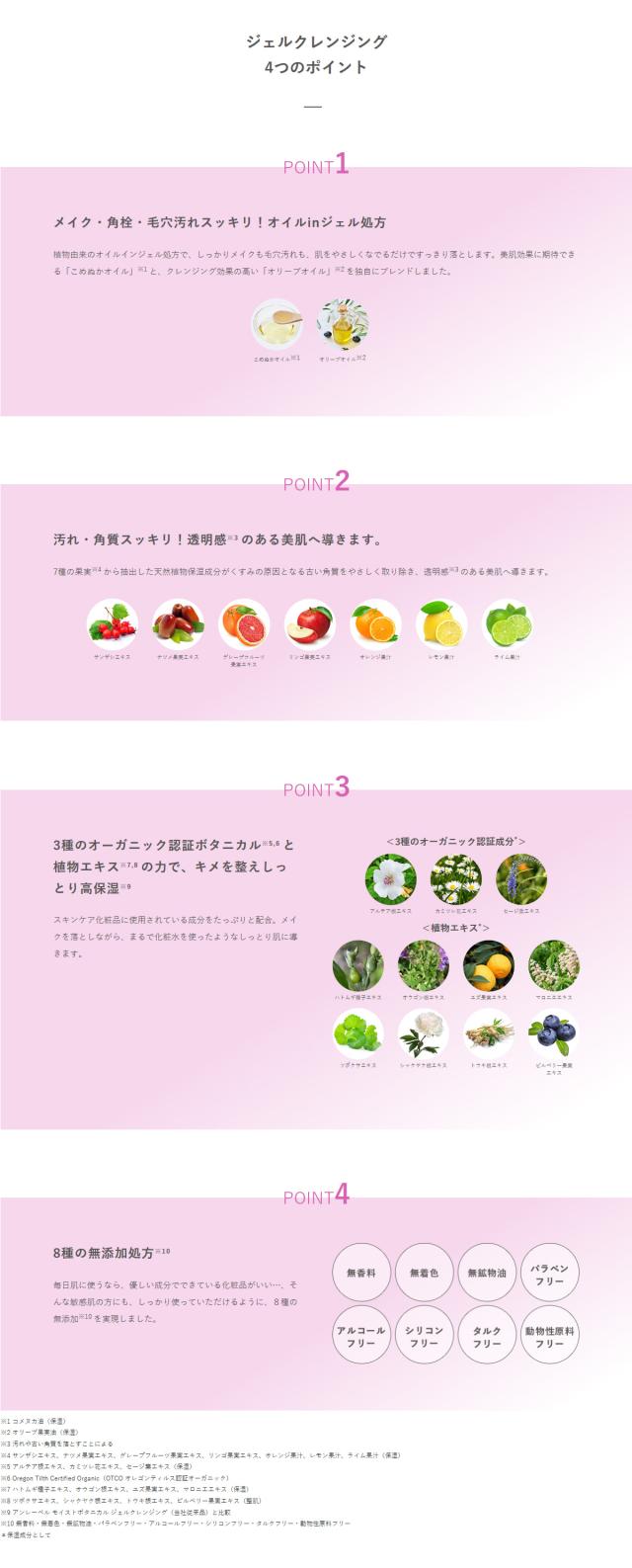 植物由来のオイルインジェル処方で、しっかりメイクも毛穴汚れも、肌をやさしくなでるだけですっきり落とします。さらに7種の果実※1から抽出した天然植物成分がくすみの原因となる古い角質をやさしく取り除き、透明感※2のある美肌へ導きます。