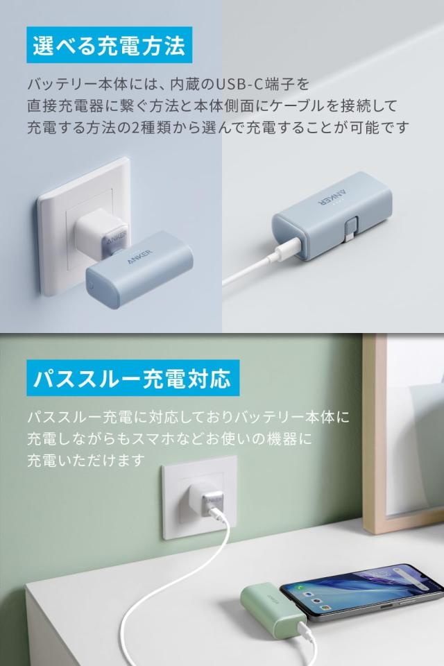 ・パススルー充電対応:パススルー充電に対応しており、バッテリー本体に充電しながらもスマホなどお使いの機器に充電いただけます。